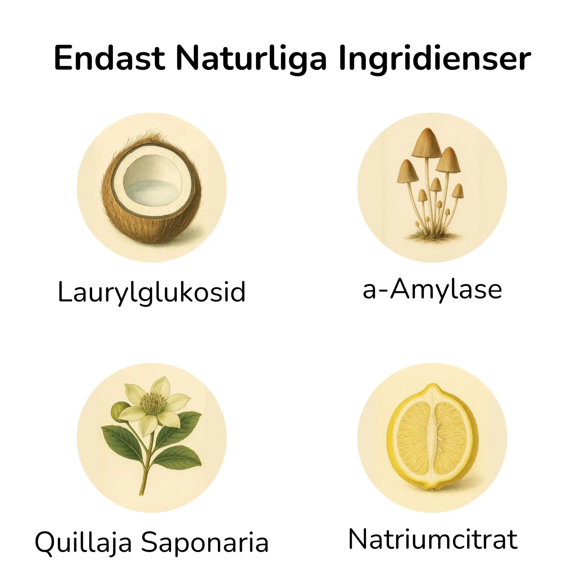 Våra plastfria diskmaskinsblad är biologiskt nedbrytbara och utvecklade med en avancerad enzymformel som är upp till 15 gånger starkare än traditionella diskmedel – helt utan skadliga tillsatser.